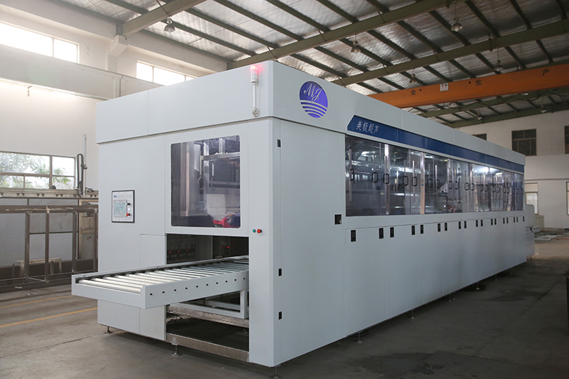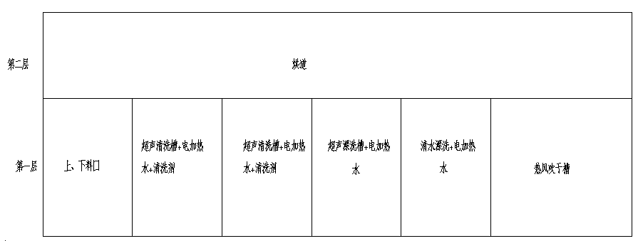 进料→超声粗洗(超声波+电加热)→超声精洗(超声波+电加热)→超声漂洗(超声波+电加热)→清水漂洗(循环过滤+电加热)→热风吹干→烘道烘干→出料